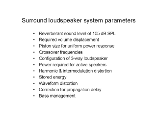 The preference in loudspeaker product design is for small size, while preserving maximum low frequency extension and output volume. If the goal is to create a realistic reproduction of a live event, then certain speaker parameters must be adequately controlled, such as volume displacement, intermodulation distortion, stored energy and off-axis frequency response. Components must be carefully selected for low distortion performance. Parameters like phase linearity and cabinet diffraction are sometimes overrated. Multi-channel speaker setups require propagation delay correction and bass management, if not all speakers cover the full frequency range. These issues are reviewed at the advent of high resolution surround sound. The new technology can only fulfill its promise and expand into more than a niche market, if capable loudspeakers are widely available.