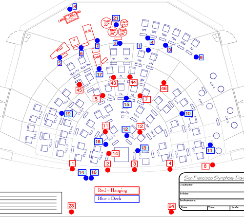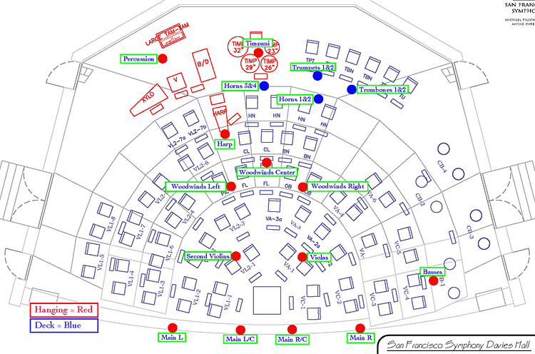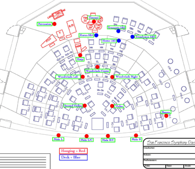 Although the above touches on the basic design and application of the San Francisco Symphony recording microphone methodology, the remaining, complementary infrastructure for the recording system has been created to comply with site-specific requirements which are detailed as follows: