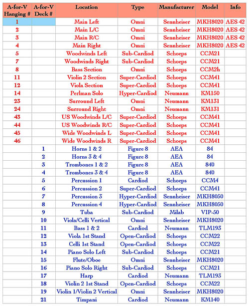 The following list contains information on both the specifics and purpose of the San Francisco Symphony microphones as used in audio-for-video productions:
