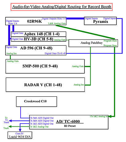 7) A/D conversion for the Merging Technologies Pyramix workstation is sourced from the Sennheiser MZD/Neumann DMI-2 AES42 combo for the Main microphones 1 through 4, the digital outputs of the Millennia HV-3D for microphones 4 through 8, and 5 Millennia AD596 A/D converters for all remaining microphone sources. The AD596 units are 8 channel, 500 series units that can be replaced in about 2 minutes in the event of failure.