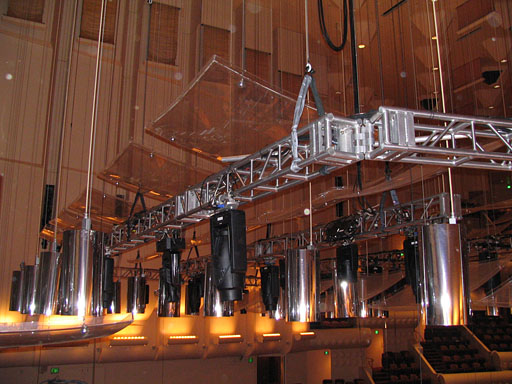 Regardless the differences in stand microphone count, the overall pickup design is based on four spaced, breasted and angled, Main omnidirectional microphones. Because of the aforementioned canopy/speaker cluster restrictions, the distance between these hanging microphones is approximately 7.5'; their height above the deck is around 9'. This spread is not typical for arrangements without a center microphone. For example, the downstage microphones in a Decca tree are likely to be spaced less that 7.5'. However, after many years of experimentation, we feel our current Main array produces a useful combination of flexibility, timbral accuracy, and musically appropriate balance for most standard symphonic concert literature.