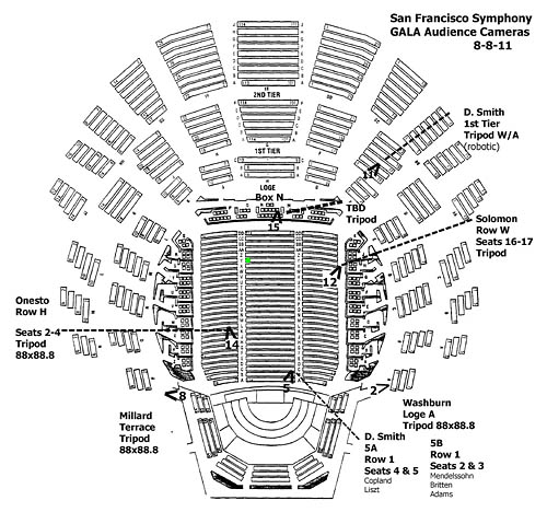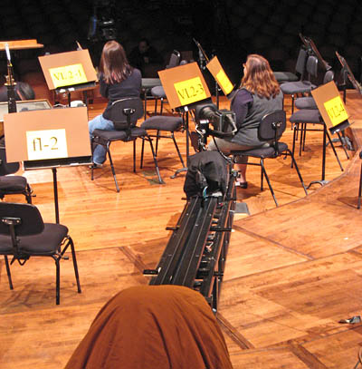 For another example, let's look at the plot for Audience Cameras in Figure 4 and locate Camera 8 on the stage left side of the terrace. That camera position was the only one that could capture many of the mallet instruments on the stage right side of the stage. Between that camera and the percussion is a lot of territory that included many hanging and stand mics. During the preliminary Card Rehearsal w/o orchestra, we had more than 4 microphones in those percussion shots. Ultimately, the solution was to actually move the entire percussion section 1 foot upstage rather than trying to change hanging microphone locations (which would have been remarkably difficult). BTW, a Card Rehearsal is a run-through of the programmed works with all the scripted camera moves but following a CD recording rather than the live orchestra. In many instances, this is the first viewing of the script/shots/lighting and allows implementing changes and corrections without having all the performers waiting around on stage. The term "Card" refers to the placards with instrumentation IDs positioned on music stands - they show where important players are located and help the video director and camera operators to refine shots and script.