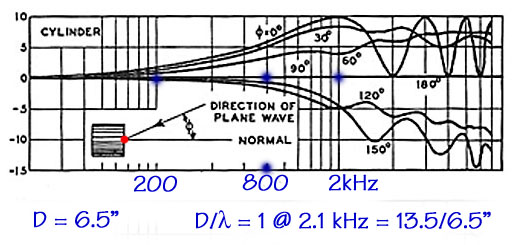 The LXmini woofer also has a baffle step, but it is in the response pointing to the ceiling. The woofer is mounted to point at the ceiling, but I listen at 90 degree off-axis, where the response is flat. You can see this behavior in the graph for a theoretical point source in the center of a cylinder. Since I operate the woofer driver only below 1 kHz, it is acoustically small. Acoustic measurements showed that I needed no eq to have a flat response. Only at the low end, where the woofer rolls off at 12 dB/octave rate and is 6 dB down at 60 Hz, did I apply some boost to extend the response to 45 Hz, -3 dB.