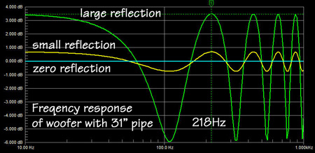 SL:  Obviously you do not want any reflected wave from the inside of the pipe to add to the direct wave coming off the cone. That's why I put just the right amount of stuffing into the pipe to completely smooth the frequency response. I can see the effect of stuffing when I place a microphone within 1 cm of the driver's dust cap, or when I look at the driver's terminal impedance. Using tone-bursts I have measured the reflections from the end of the pipe in front of the woofer cone to be 40 dB lower than the direct signal from the cone. That is a 1% reflection factor or 40 dB return loss. Not bad for someone like me, who worked with microwave transmission lines.