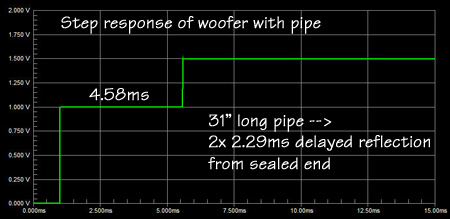 The woofer pipe has a major benefit over your box, even though their internal volumes are not greatly different. The pipe gives me a conduit, an acoustic transmission line, for the wave from the rear of the woofer cone to travel along. For example, if a step is applied to the woofer, then the pressure wave travels from the cone to the end of tthe pipe. Since the pipe is sealed, the wave is reflected and travels back up to the cone. There it adds to the pressure, which the cone was radiating into free-space. You can see the process in the left picture below. The picture was derived from an electrical transmission line model.
