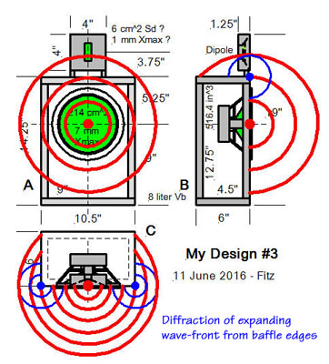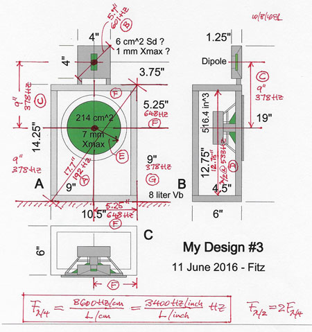 SL:  Your Design #3 drawing gives me the dimensions of the internal box cavity. At low frequencies where any of its dimensions are small compared to a quarter-wavelength the air volume acts like a spring. The larger the volume, the more compliant is the spring. The largest inside dimension is L = 12.75", which corresponds to a l/4-frequency