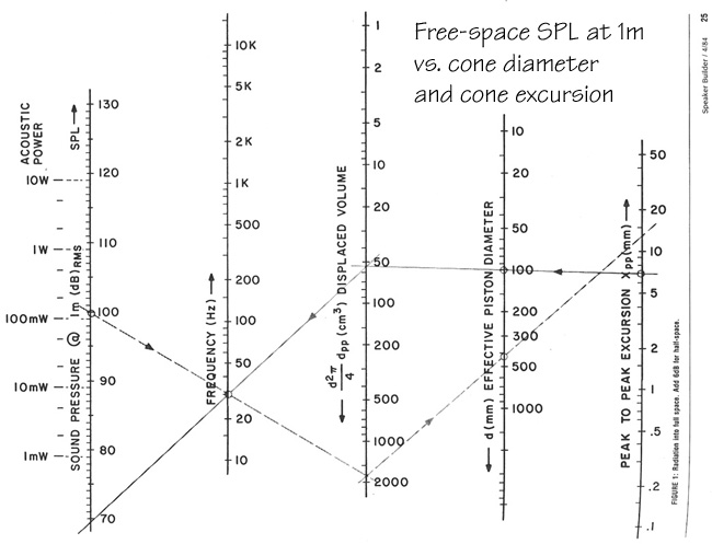 SL:  Above 250 Hz, when your woofer box is no longer acoustically small, then acoustic matters become more complicated. Radiation from the driver in the box is no longer omni-directional. Below 250 Hz your woofer acts essentially like a point source, like a pulsating sphere and it is easy to predict the SPL, which it will generate in free-space at 1 m distance from the nomograph below.