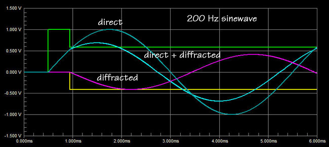 SL:  And you can see how at 200 Hz the diffracted wave subtracts vectorially from the direct wave, because a 0.444 ms delay corresponds to only 32 degree of phase shift.