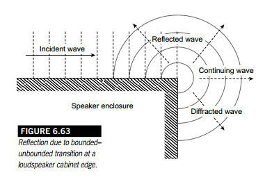 SL:  That's where it gets interesting, because now the reflections from the edges of the baffle come into play. Assume for a moment that the front of your box is just a flat sheet of wood and that a point source is radiating from the center of your woofer's location on the sheet. The front of the radiated wave propagates like an expanding half-balloon until it hits the edge of the the box. As soon as the half-balloon goes over the edge the volume of air inside the balloon gets redistributed. The force, with which the balloon surface was expanding, drops to a lower value. The balloon surface becomes distorted.
