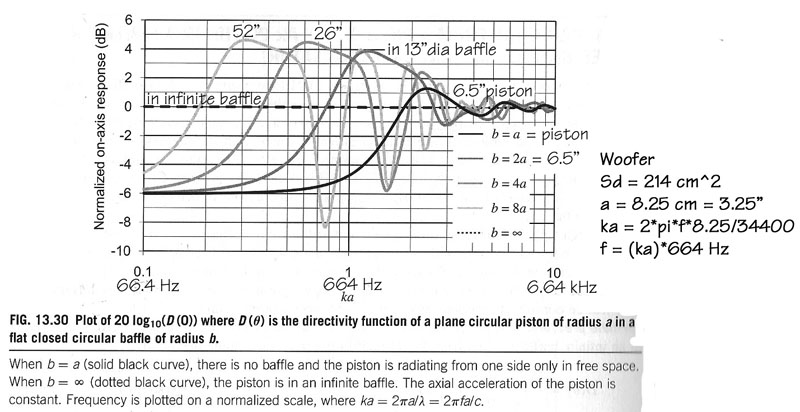 SL:  Yes, but it could also be a smaller space. And actually, I have given you only a first order description of diffraction. I have used an electrical transmission line model to derive the on-axis, far-field, time and frequency responses for the case of a point source in the center of a disc with R = 6".