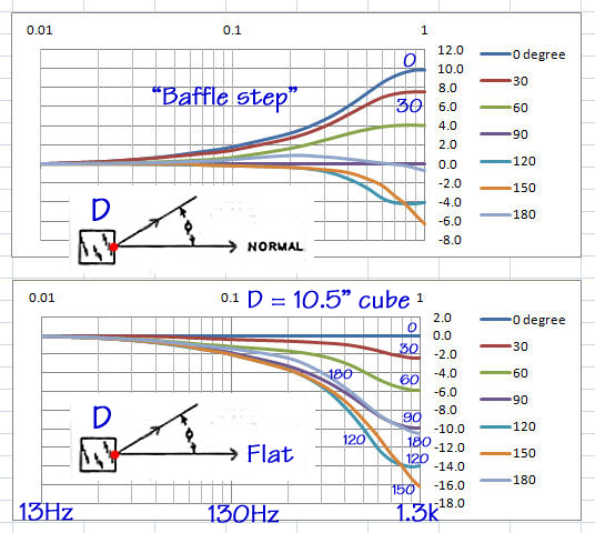 SL:  Indeed, it is difficult to analyze the diffraction from a rectangular box. At this time my I just want to explain the fundamental principles, which come into play when we investigate diffraction effects. I will therefore use a 12" diameter solid cylinder of 6" height with an acoustic point source at the center to broadly simulate diffraction effects of your box.