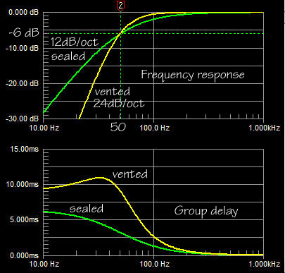 SL:  Good that you chose a sealed box and not a vented box. The graphs here show a comparison between between a sealed box with Qb = 0.5 and a vented box with the same 50 Hz, -6 dB corner frequency.