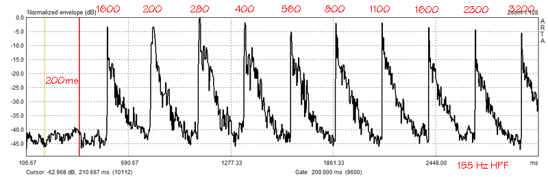 The effectiveness of the filter is visible in the wave form of the burst ETC taken in my small office room. The highpass filter was used in Figure 11, but not in Figure 12. You can compare the two files in more detail using ARTA with office-hpf.pir and office-no-hpf.pir.