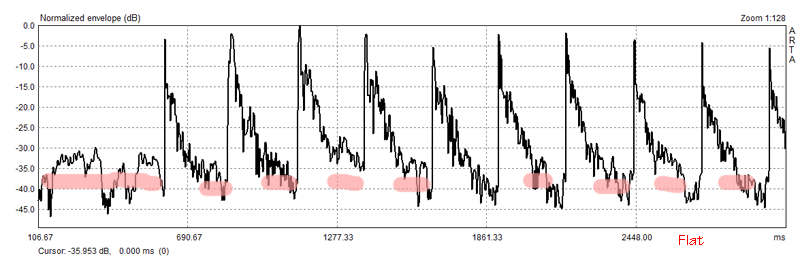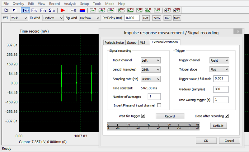 Download Burst files: Play the files in Repeat mode. Push Record in the ARTA Signal Recording window when you hear the 400 Hz burst at the end of a burst sequence. For practice, download and open with ARTA the "impulse response" file, which was used for the above graphics: |