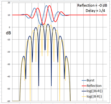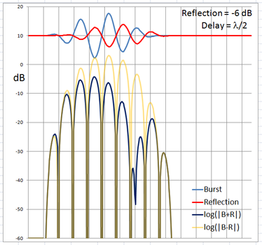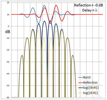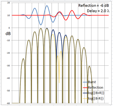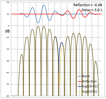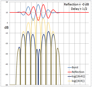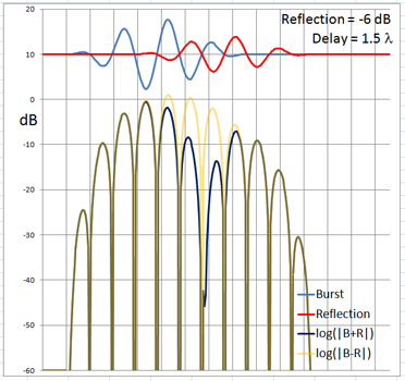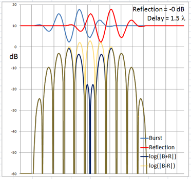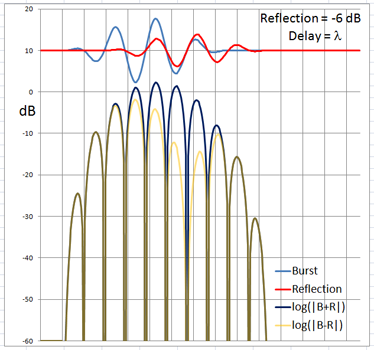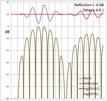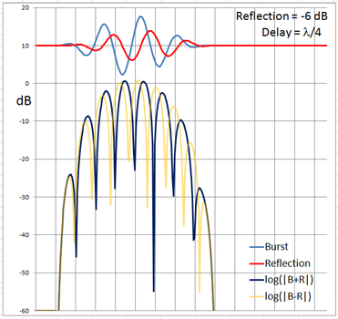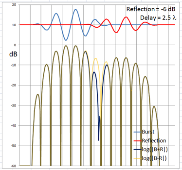 The 4-cycle burst has a duration corresponding to four wavelengths at the chosen frequency. At low frequencies and long wavelengths reflections will overlap in time with the direct signal if the reflecting path is less than four wavelengths longer than the direct signal path. Below are examples of the ETC for a single reflection at 0 dB (not likely) and -6 dB overlapping with the direct signal at different delays. (burst-overlap.xlsx)