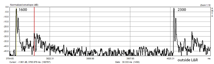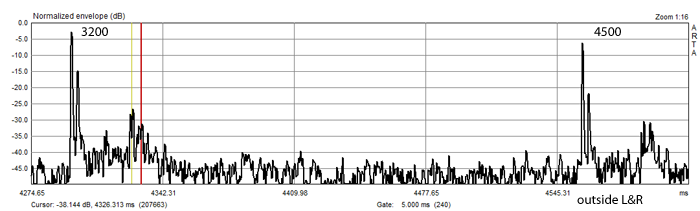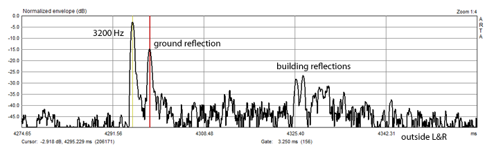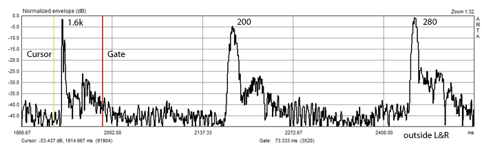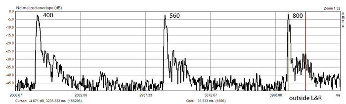 The burst sequence starts with a 1.6 kHz burst, which indicates a close-in reflection of about 9 dB lower level than the direct response. It is followed about 35 ms later by several reflections, which are more than 24 dB down. The vertical lines for Cursor and Gate are separated by 73.333 ms in this example. Their purpose is for time measurements and signal identification. The duration for a 1.6 kHz burst is 2.5 ms according to the table under 5) below. That duration is short enough to resolve the first reflection from the direct signal. For a 200 Hz burst of 20 ms duration the first reflection, which is 3 ms delayed and 20 ms wide, overlaps almost completely with the direct signal. The resulting signal shape can take many forms. The presence of reflections with 35 ms delay only complicates the interpretation of the response shape. The outside test produced an audible echo. Maybe the cluster starting 80 ms after the 200 Hz burst is an indicator of this echo.