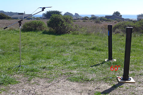 Room reflections+++ CM-LX521 +++ CM-B2031 +++ SPC-Watson +++ SPC-LX521 +++ SPC-Pluto +++ Mixing Studio +++ WATSON loudspeakers outdoors of Sea Pine CottageAs an experiment I set up the WATSON outdoors where there would be few reflections, except for the ground reflection. On phantom center tests I could hear distant echoes. The breaking waves of the Pacific Ocean gave a fluctuating and fairly high background noise level on the day of the experiment. Using voice signals the center phantom is is heard only in a spot along the symmetry line. Moving slightly left or right the timbre changes. For larger displacements the timbre is as for the center spot and the image is between center and the nearest speaker. When standing in front of left or right speaker the phantom source spreads from the speaker somewhat towards the center. 1) - Outdoor Loudspeaker Setup