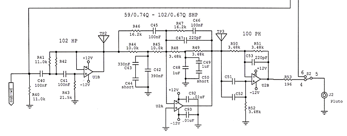 To obtain the desired 100 Hz LR4 acoustic crossover behavior for the subwoofer it is merely necessary to cascade an electrical LR4 lowpass filter (U4) with the biquad equalizer (U5B). The LR4 acoustic highpass filter for PLUTO, though, requires more effort since that speaker's low frequency response has a 2nd order roll off below 60 Hz. This must be equalized - again with a biquad (U2A) - to become an acoustic highpass with fp = 100 Hz and Qp = 0.7 to form one of the two LR4 crossover highpass filter stages. The other stage (U1B) then uses the standard electrical LR4 filter topology. The low frequency response of PLUTO is most easily measured with the microphone about an inch above the dust cap of the woofer/midrange cone. Measured frequency points are entered into the spreadsheet box-eq-pluto.xls. The unknown values for f0 and Q0 of PLUTO are found by varying the values for f0 and Q0 in box 1) until the Original curve in the graph matches the Measured curve. In this case f0 = 60 Hz and Q0 = 0.75 and standard component values for the biquad become: R1 = 10k, R2 = 16.2k, R3 = 3.48k The complete 100 Hz LR4 electrical highpass filter for PLUTO is shown below. Together with subwoofer equalization and lowpass filtering it can be easily implemented on the w-ASP printed circuit board. The pcb has a general topology that makes it useful for any woofer and its crossover.