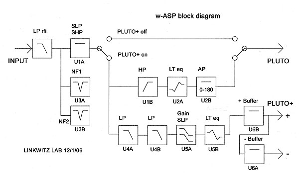 100 Hz crossover filterThe PLUTO+ subwoofer is an addition to the 2-way PLUTO and was designed to reduce the low frequency demands on its relatively small woofer driver which limits output volume and low frequency response. The small driver was chosen to obtain omni-directional response into the transition region to the tweeter. The design goal for PLUTO+ was to leave PLUTO unchanged and not to require circuit or component changes. Something similar was done with the addition of THOR to ORION. In order to accomplish this, some of the low frequency content of the input signal must be shifted away from PLUTO so that it is reproduced by the subwoofer instead. This task is not as straight forward as it may seem, because PLUTO's acoustic low frequency response is that of a 2nd order highpass filter with -3 dB corner at 60 Hz. Cascading this filter with any standard 100 Hz electrical crossover filter highpass section will not result in a 100 Hz acoustic crossover. PLUTO's response determines the missing electrical filter response, that when added leads to the desired LR4 acoustic crossover response. The block diagram of the w-ASP shows the necessary circuit elements for crossover filters and equalization of both PLUTO and its subwoofer PLUTO+.