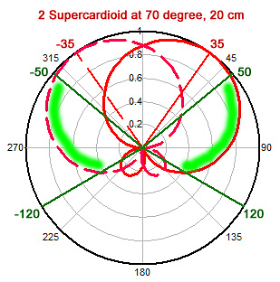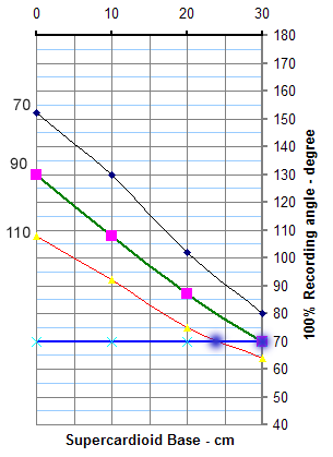Assuming supercardioid microphones and the 700 view of the scene from above one could obtain a 100% SRA with microphones that are spaced 23 cm apart and angled at 1100 or one could use a 900 mounting angle and 30 cm separation. It may seem counter-intuitive that the recording angle becomes narrower as the mounting angle widens, but this is a function of the polar response and the ratio of left and right microphone output voltages. The SRA for a fixed mounting angle also becomes narrower as the mounting base widens.