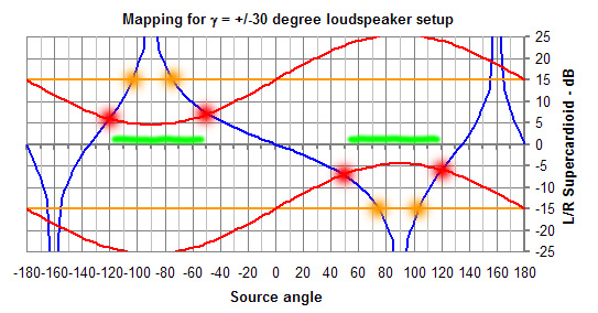 The ratio of Left to Right microphone outputs in dB is shown as the blue curve below. The orange lines at +/-15 dB indicate the threshold for mapping the phantom image to the Right or Left loudspeaker. Where they intersect is the SRA for coincident microphones, in this case at +/-750 for a total angle of 1500. The second intersection at +/-1030 indicates the angles beyond which the phantom image shows up between the loudspeakers again.