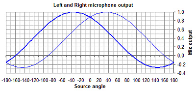Here are two presentations of the relative microphone output voltage as a function of the source angle from where sound is arriving at the two microphones. The rectangular graph above is more convenient of the two for reading the output voltage from each microphone at a given source angle. The polar diagram gives a picture that relates better to the floor plan.