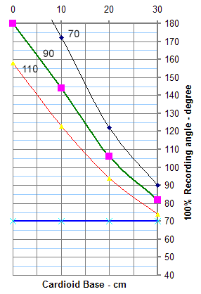 The stereo recording angle, SRA, of the 2-microphone array is a function of the type of directional microphone used, of the mounting angle between the microphones and of the spacing between them. The SRA can be conveniently read from Helmut Wittek's  IMAGE Assistant 2.0 on the hauptmikrofon.de website. Below I have plotted 100% recording angle values for full Left to Right loudspeaker mapping and 75% angles for a slightly wider view of the recording venue scene. I think that the 75% angles are actually better defined. The derivation of recording angles is shown later. The plots are for 700, 900 and 1100 degree mounting angles, and for 0 to 30 cm spacing, and for cardioid (r = 0.5 + 0.5 cos(a)) and supercardioid (r = 0.366 + 0.634 cos(a)) polar responses. The data points for the curves are based on perceptual observations and therefore carry some uncertainty. The graphs should be analyzed for trends in order to find the optimum microphone array configuration.