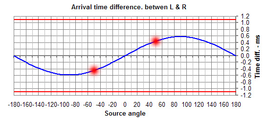 A 20 cm spacing between the microphones gives a maximum time difference of 0.59 ms when the source signal arrives from 900. The difference becomes zero when the signal arrives from the front at 00. It varies as the sine of the source angle. This spacing is not enough to move a signal fully to the left or right loudspeaker.