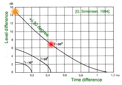 Underlying the recording angle theory are observations as to what level and time differences between Left and Right loudspeaker drive signals will make the phantom image move to either the Left or the Right loudspeakers which are located at g = 300 from the center line. The graph from Simonsen, 1984, also shows the level and time differences to move the phantom image 200 or 100 away from the center line.