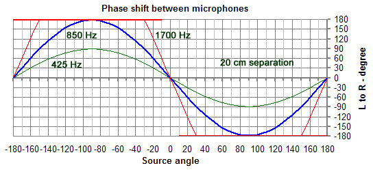 A look at the phase difference for 20 cm microphone spacing reveals that phase can become ambiguous for frequencies above 850 Hz. It is uniquely defined as being less than 1800 for lower frequencies.