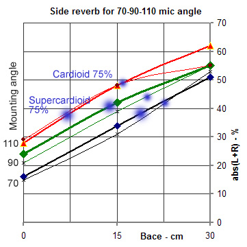 I have analyzed the dependency of mono or side reverberation upon the microphone configuration using the procedure outlined below. The result is summarized in the graph on the left.