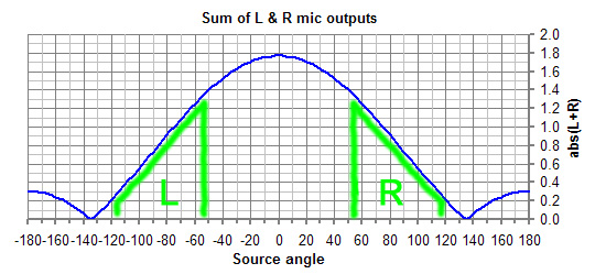 The blue curve below shows the sum of Left and Right microphone outputs on linear scales. The mono reverberation region is bounded by the green shades. It is of interest to know the percentage of the green areas in comparison to the total area under the blue curve. An approximate integration yields a value of 42%. The total stereophonic reverberation is the remaining 58%. The rear contribution to that is from angles beyond +/-1350.