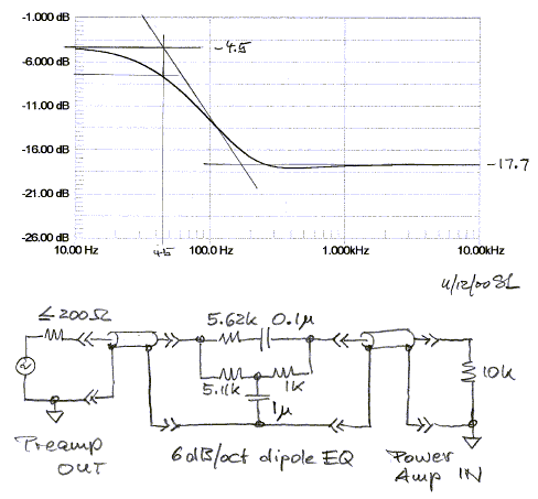 A simple active line level equalizer avoids the high insertion loss, large output voltages from the preamplifier, and the 10k amplifier input impedance requirement of the passive network. A more complicated circuit could be used to to push the influence of the 8" driver parameters to a lower frequency. Since this also increases cone excursion demands it is more appropriate to use a separate dipole woofer. A circuit with the desired response can be constructed using one of my general topology printed circuit boards.
