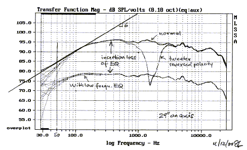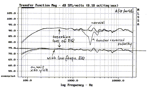 The woofer crossover/eq response is obtained from a passive line level network between preamplifier and power amplifier. The disadvantages of this solution are 1) a high insertion loss, and 2) the exact transfer function can only be approximated.