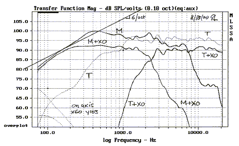 Reversal of the tweeter polarity and the ensuing depth of the notch indicate the accurate addition of midrange and tweeter output through the crossover region in normal mode.