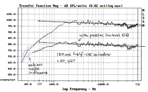 The low frequency response can be extended with the same passive line level equalizer network as for the PMT1 speaker above. For a closer look at the corrected response the time data record for the FFT is increased to 120 ms. The resulting frequency response is no longer anechoic and includes reflections from surroundings of the outdoor test site. The ripples in the response are an indication of this and may have been caused by objects as far as 60 feet away.