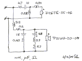 The midrange lowpass filter in the crossover has an unusual topology to correct for the peak and extend the flat region of the response. The dc resistances of the two coils in the lowpass section are included in the resistor values shown.