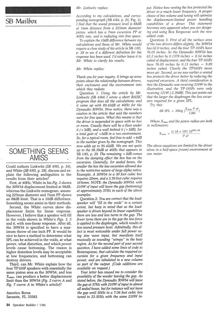 Loudspeakers--- What should they do? --- Design of loudspeakers --- Loudspeaker evaluation --- Accurate stereo --- Whatever happened? --- --- Room acoustics --- Sound field control --- Other designs --- System design --- Loudspeaker system design A Three-Enclosure Loudspeaker System Excursion-Limited SPL Nomographs Speaker Builder Mailbox ----------------------------------------------------------------------------------------------------------------------------------------------------------
