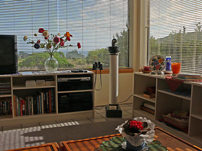 The added Vista Room with its view of meadow and ocean white water is my home for the LX521.4. As I have set it up it exhibits all the nice characteristics that I hear from them in my much longer room in Corte Madera. Only the bottom end required experimentation with speaker placement/orientation and sofa-bed placement. The problem was a l/4 distance at 60 Hz between a listener and the wall behind him causing a 60 Hz interference dip at the listener's location. The dip was measurable and audible on a sustained 60 Hz tone but rarely on program material. The sofa-bed acts also as an acoustic absorber, which ameliorates the dip. The white stool is for putting up the legs when seated on the sofa.