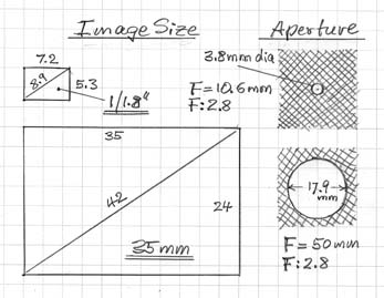 Thus, if some object filled the frame of a 35mm film camera through a 50mm lens, then that object would also fill the frame of a 1/1.8" sensor on a digital camera, like the FZ50, when its focal length is zoomed to 50mm / 4.73 = 10.6mm. Both cameras have the same angle of view in this instance.