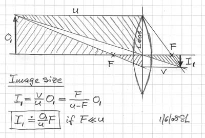 The image size I1 produced by a lens for a given object O1 at distance u in front of it, is directly proportional to its focal length F.