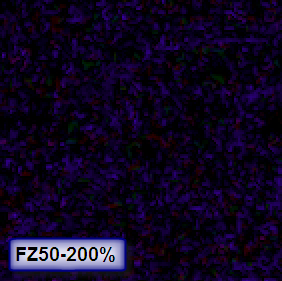 2 - Camera dark noise testsThis type of dark noise analysis was performed on four related cameras, Lumix LX2 and FZ50, and Leica D-Lux 3 and V-Lux1. The ISO 800 and RAW mode were chosen to show maximum noise. Exposure time was 1 second. Noise is shown at 100% and 200% magnification and with the color removed.