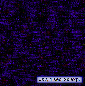 From this qualitative dark noise analysis it would seem that the D-Lux 3 has the lowest noise. The FZ50 and V-Lux 1 are about equal but with the FZ50 having a slight edge. Note that the two different camera sensor types have different noise patterns. Overall the LX2 may be the worst performer because of a less random noise pattern. Furthermore the noise patterns are not locally fixed in the image pixel matrix which some further testing confirmed. They are caused by time varying noise.