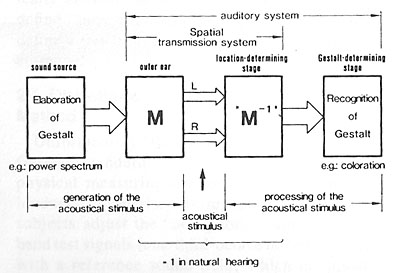 The first stage responds very quickly and uses primarily high frequency transients in the superimposed sound streams at the two ear drums. It serves as an important survival mechanism in conjunction with stereo vision. The second stage recognizes patterns in the superimposed streams, compares them to memory and makes sense of them. This takes time and involves learning as the perceived auditory scene is rarely static and often evolves as different sources illuminate their physical environment. When they get reflected back to the listener they tell about the Gestalt of the Auditory Scene. |