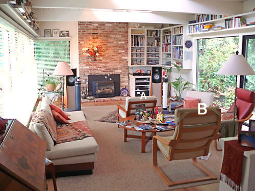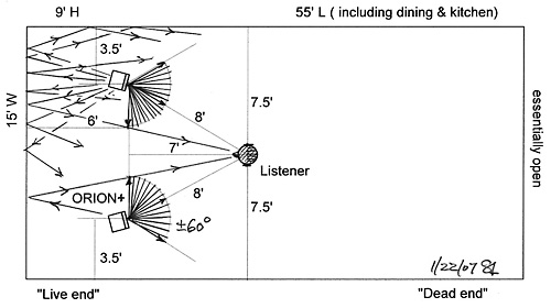 Also, it is a widely held belief that reflections destroy transients and diffuse phantom images. Reflections must be avoided. Yet they are important for energy distribution in the room. This belief has been slowly changing (e.g. Moulton, Toole), but only for lateral reflections. The space behind the speakers has always been suspect for changing the sound unfavorably, and rightfully so. Almost all loudspeakers illuminate this space unevenly and sonically colored. I now also understand why flush mounted speakers sound off-the-wall to me. They completely lack rear wall reflections and thus important spatial cues. One might postulate that the wall reflection will add a sameness to all sound playback because the listening room acoustics from reflections right close to the loudspeakers get mixed in heavily with the recorded acoustics. The exact opposite is heard. Recordings become more differentiated, the whole range from dead to wet acoustics is clearly perceived. Furthermore, what is perceived as "distortion" is more readily identified: analog tape compression (Cantate Domino, track 1, PRCD 7762), ringing of the hall (Star of Wonder, track 16, RR-21CD), or spectral discontinuity of phantom sources due to microphone mix (Soular Energy, The Ray Brown Trio, track 2, CCD-4268), etc. The rightness of a live recording really shines (Swing Live, Bucky Pizzarelli, track 7, JD218). The "Volume Control" should be relabeled as "Distance Control". I like it that I can slide quite a few rows closer to the orchestra merely with a button push on my remote volume control. It seems that the ringing of the listening room ultimately limits the maximally tolerable SPL and not necessarily the non-linear distortion of the loudspeaker. When listening in a room and someone opens a door or window you hear outside sounds, different acoustic spaces. Their perceived character is not changed by having entered and mixed with your living room, though their physical properties are changed.