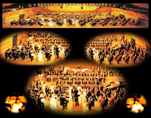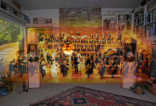 Are they HERE or are you THERE?When you listen to your loudspeakers do you have the illusion that the performers are in your living room, or do you feel transported to the recording venue? The clarity of your speakers, how uniformly they bathe your room in sound, the talk-back of the room, and most importantly the spatial cues imbedded in the recording itself, they all influence whether one or the other of those illusions forms in your mind, or whether there is little sense of a definable acoustic space at all. Recording is a difficult process, more art than science. Though a large body of science and best practices exists many "recording engineers" seem to have insufficient knowledge of how their various takes on reality might be perceived and appreciated when they are reproduced by a highly accurate loudspeaker system in the living room. Many times I have wished that I could set the producer of a particular recording into my listening chair and ask him: What were you trying to accomplish? Let me illustrate some recording practices. Below is the photo of a symphony orchestra with green dots that represent possible microphone locations.