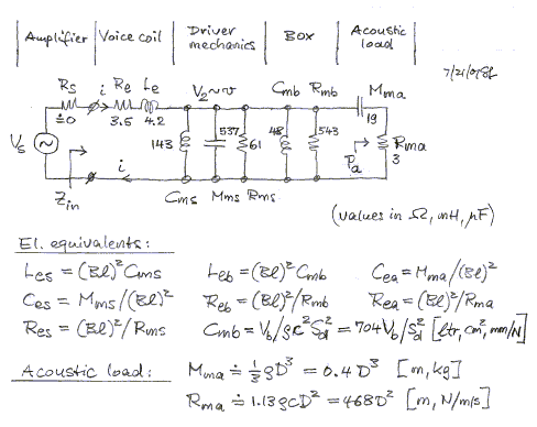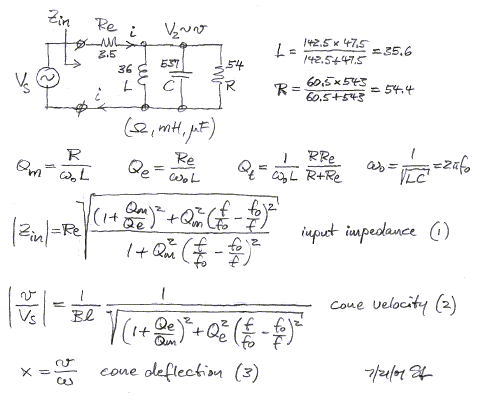 The electrical model uses the force --> current (velocity --> voltage) analogy between mechanical and electrical impedances. The conversion from acoustical impedances (p/q) to mechanical impedances (F/v), which involves Sd, and the conversion from mechanical to electrical impedances (V/I), with the use of Bl, is described in books on electro-acoustics. The electrical impedance model looks like the following circuit with component values derived from the XLS 830500 driver specifications and a 47 liter box.  See closed-box1.xls for calculation of the values.
