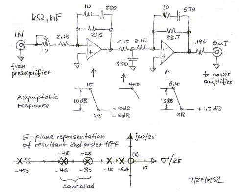 to F0 = sqrt(30 x 46) = 37.2 Hz and Q0 = 37.2/(30 + 46) = 0.49. The necessary boost in gain cannot be carried too far, or the equalizer circuit runs into voltage clipping at the power supply rails. Since it is likely that there will be some room gain at the very low frequency end, the response is not equalized to be flat, which helps with the clipping concern. A subsonic rumble highpass filter would defeat the purpose of the subwoofer. I have not found that rumble is an issue, if the subwoofer system is designed for large voltage swings and volume displacements.