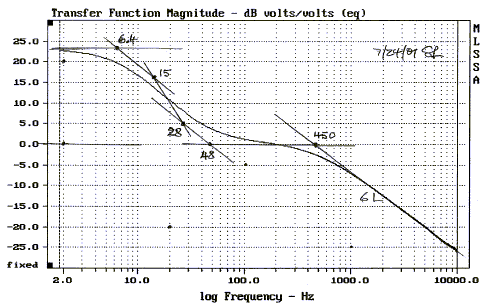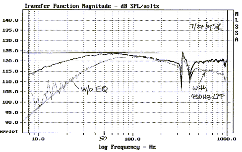 The actual low frequency response curve was arrived at interactively, by observing the acoustic response, while modifying the two low frequency corners of the boost. The ultimate roll-off is governed by these new poles at 15 Hz and 6.4 Hz. The 450 Hz pole compensates for the rise in response as the woofer becomes directional. This removes associated phase shift from consideration when crossing over around 100 Hz.