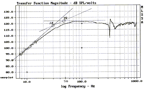The straight line asymptotes of 12 dB/oct and 6 dB/oct slope for the calculated poles at 19 Hz and 67 Hz give only a marginal fit to the measured response. A better approximation appears to be with poles at 30 Hz and 46 Hz, as in the following graph.